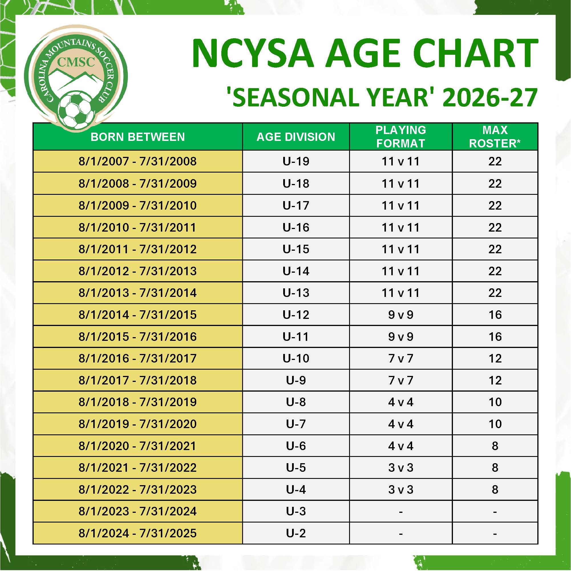 Beginning in the 2026-27 season, NCYSA, in cooperation with U.S. Youth Soccer, will transition away from calendar-year (Jan. 1-Dec. 31) to school-year (Aug. 1-July 31) age group formations. In order to remain eligible to compete with NCYSA, CMSC must comply with this change.